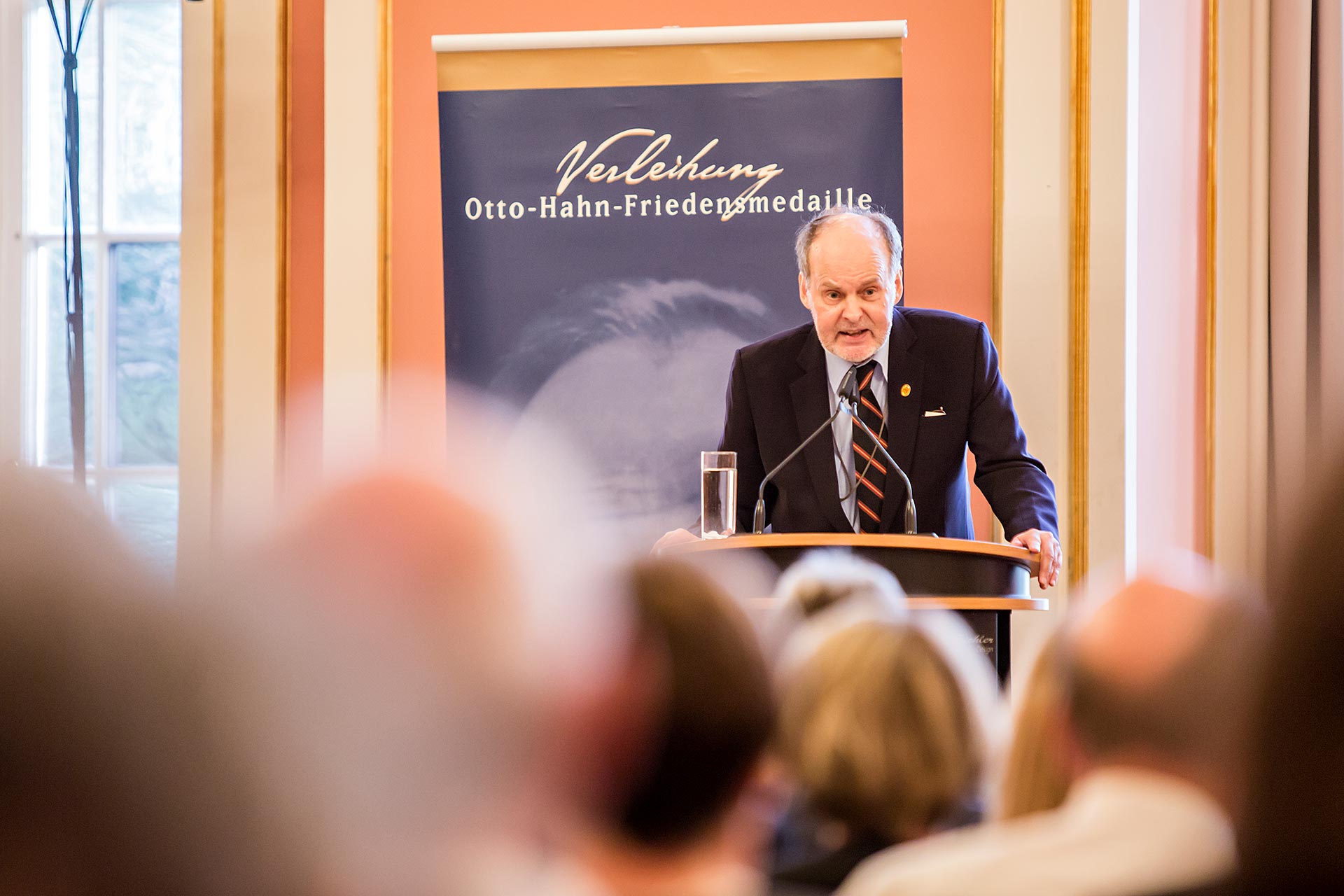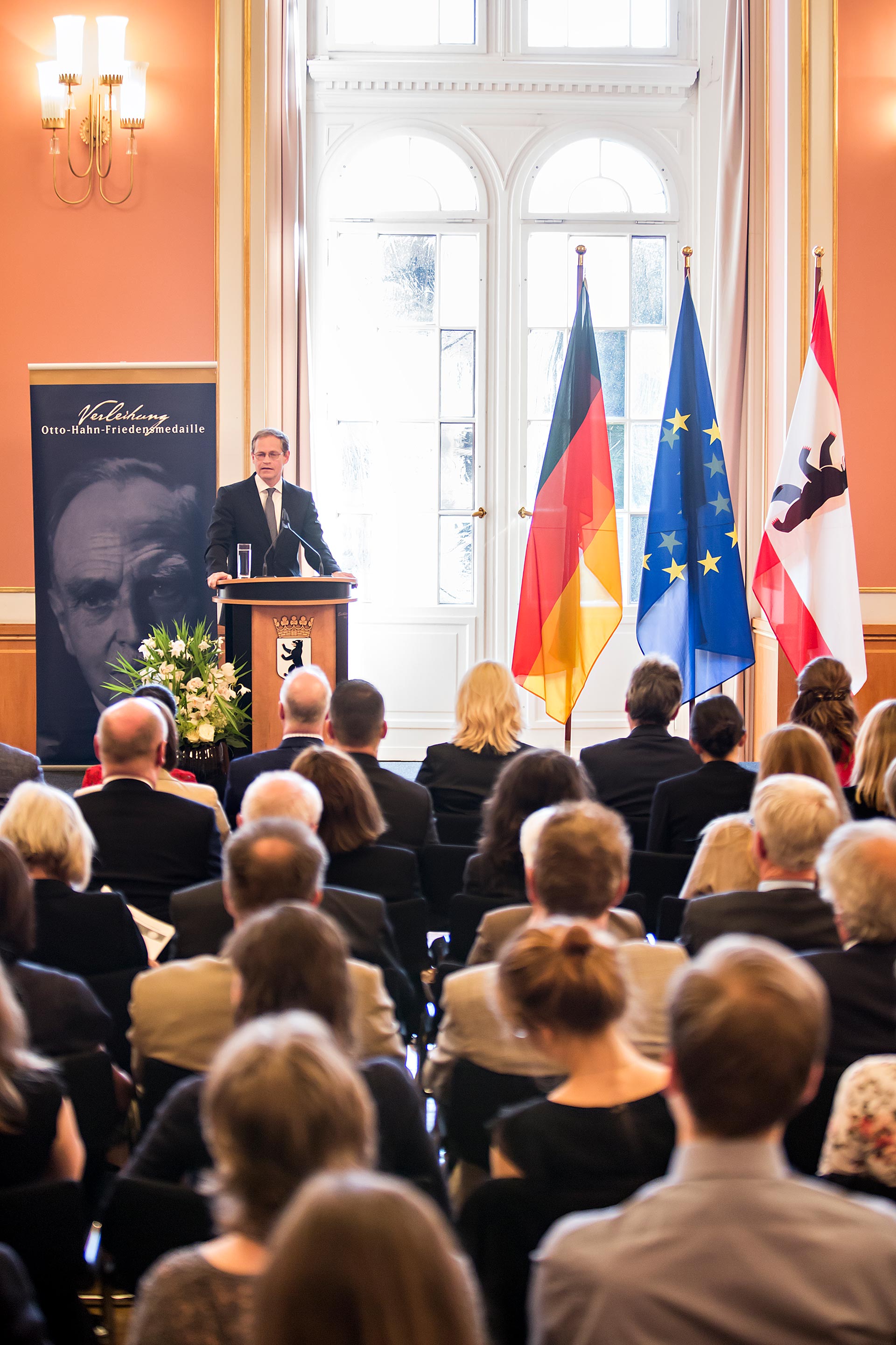 Ich danke dem Stifter Dietrich Hahn, dessen Großvater Otto Hahn war, sehr herzlich dafür, dass er 1988 diese Ehrung für Berlin gestiftet hat. Damals lag Otto Hahns epochale Entdeckung 50 Jahre zurück. Und die Menschen in der geteilten Stadt sahen sich immer wieder durch die Ost-West-Konfrontation bedroht. Mit der Friedlichen Revolution und der Wiedervereinigung Berlins wurde auch das auf Frieden und Völkerverständigung beruhende Vermächtnis Otto Hahns erfüllt. Die Verleihung der Otto-Hahn-Friedensmedaille in und von Berlin aus erinnert auch daran, dass Frieden und Verständigung möglich sind, wenn sich Menschen dafür tatkräftig engagieren.