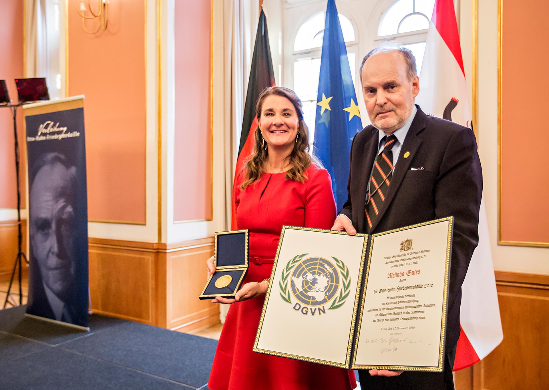 Die Deutsche Gesellschaft für die Vereinten Nationen (DGVN), Landesverband Berlin-Brandenburg, verleiht am 25. Mai 2017 die Otto-Hahn-Friedensmedaille in Gold an die Philanthropin und Mitgründerin der Bill & Melinda Gates-Stiftung für globale Entwicklung und globale Gesundheit Melinda Gates.