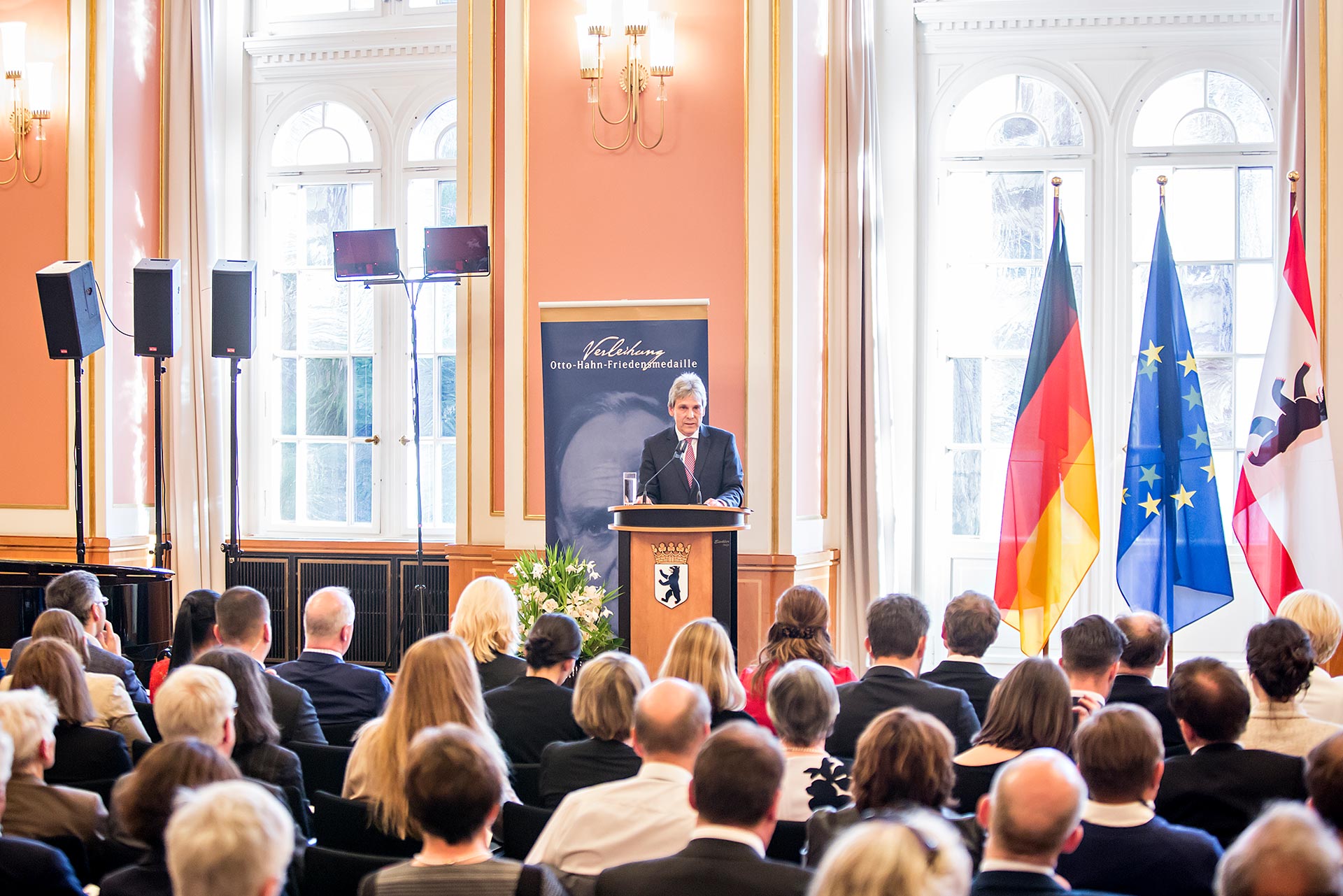 Ich danke dem Stifter Dietrich Hahn, dessen Großvater Otto Hahn war, sehr herzlich dafür, dass er 1988 diese Ehrung für Berlin gestiftet hat. Damals lag Otto Hahns epochale Entdeckung 50 Jahre zurück. Und die Menschen in der geteilten Stadt sahen sich immer wieder durch die Ost-West-Konfrontation bedroht. Mit der Friedlichen Revolution und der Wiedervereinigung Berlins wurde auch das auf Frieden und Völkerverständigung beruhende Vermächtnis Otto Hahns erfüllt. Die Verleihung der Otto-Hahn-Friedensmedaille in und von Berlin aus erinnert auch daran, dass Frieden und Verständigung möglich sind, wenn sich Menschen dafür tatkräftig engagieren.