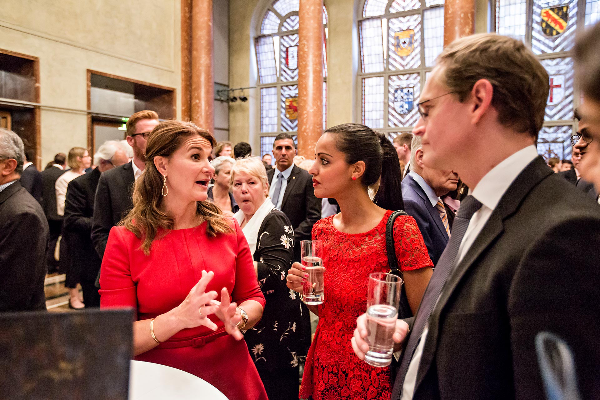 Die diesjährige Medaillenverleihung fand mit über 300 geladenen Gästen im Großen Saal des Berliner Rathauses statt. Sowohl Michael Müller, der Regierende Bürgermeister von Berlin, als auch Dr. Lutz-Peter Gollnisch, der Vorsitzende des DGVN-Landesverbandes, betonten in ihren Eröffnungsreden noch einmal Melinda Gates´ herausragende Verdienste beim Kampf gegen extreme Armut und für eine bessere Gesundheitsversorgung. Dietrich Hahn, der Enkel Otto Hahns und Stifter der Medaille, zählte die Gemeinsamkeiten von Melinda Gates und Otto Hahn auf und verkündete, dass ihr Handeln ganz im Sinne eines humanitären Handeln ist, wie es sich Otto Hahn vorgestellt und gewünscht hätte.